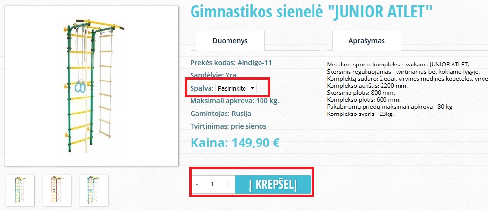 Prekės kortelėje pasirinkite prekės spalvą (jei yra) ir įdėkite prekę į krepšelį, kaip parodyta nuotraukoje.