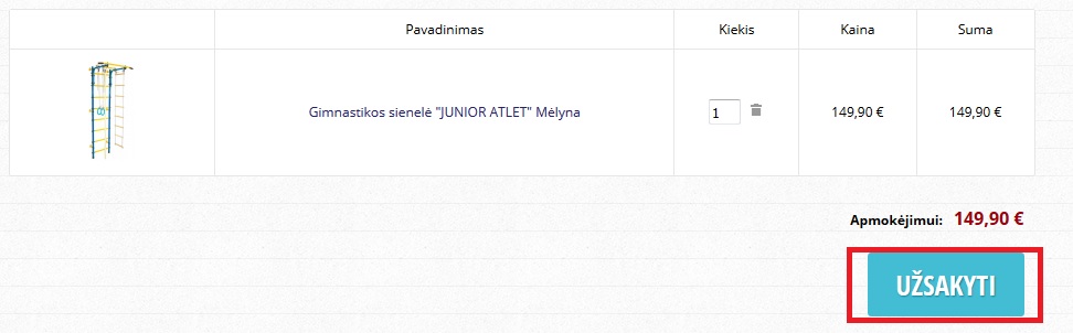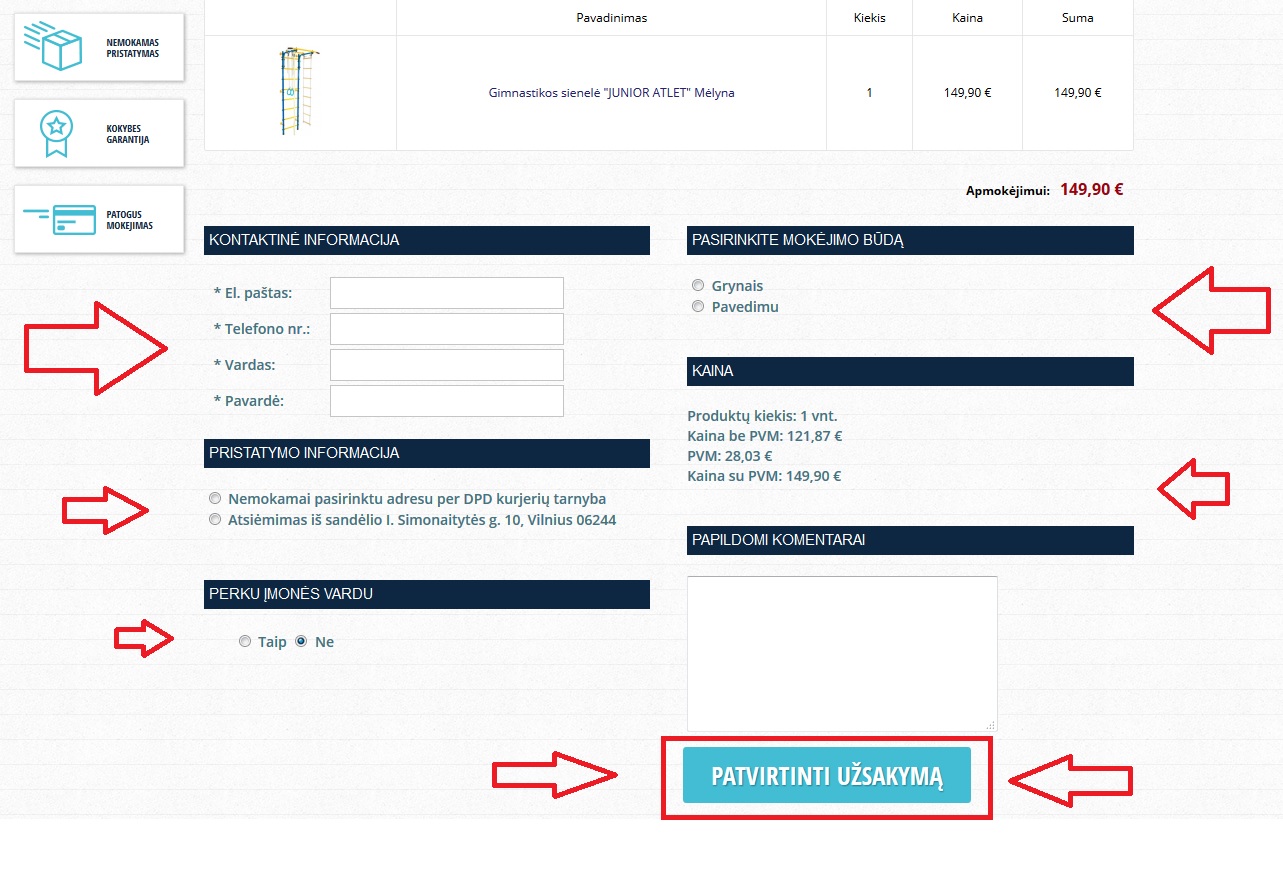 Paskutiniame etape reikia užpildyti kontaktinę informaciją, pasirinkti pristatymo būdą, bei apmokėjimo variantą ir paspausti patvirtinti užsakymą.